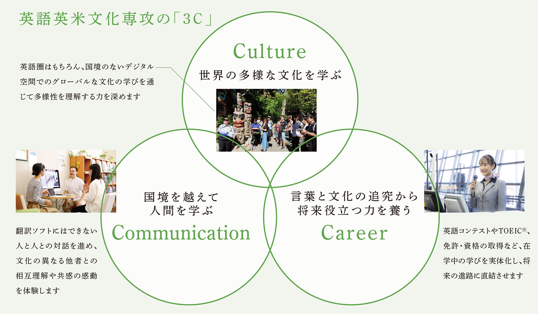 多文化共生社会の実現をめざす本学部は、異文化理解に根ざします。多様性への対応力を養うため、3専攻共通科目の「異文化論入門」や各専攻の専門科目、海外渡航・国内研修プログラムなどを設けています。