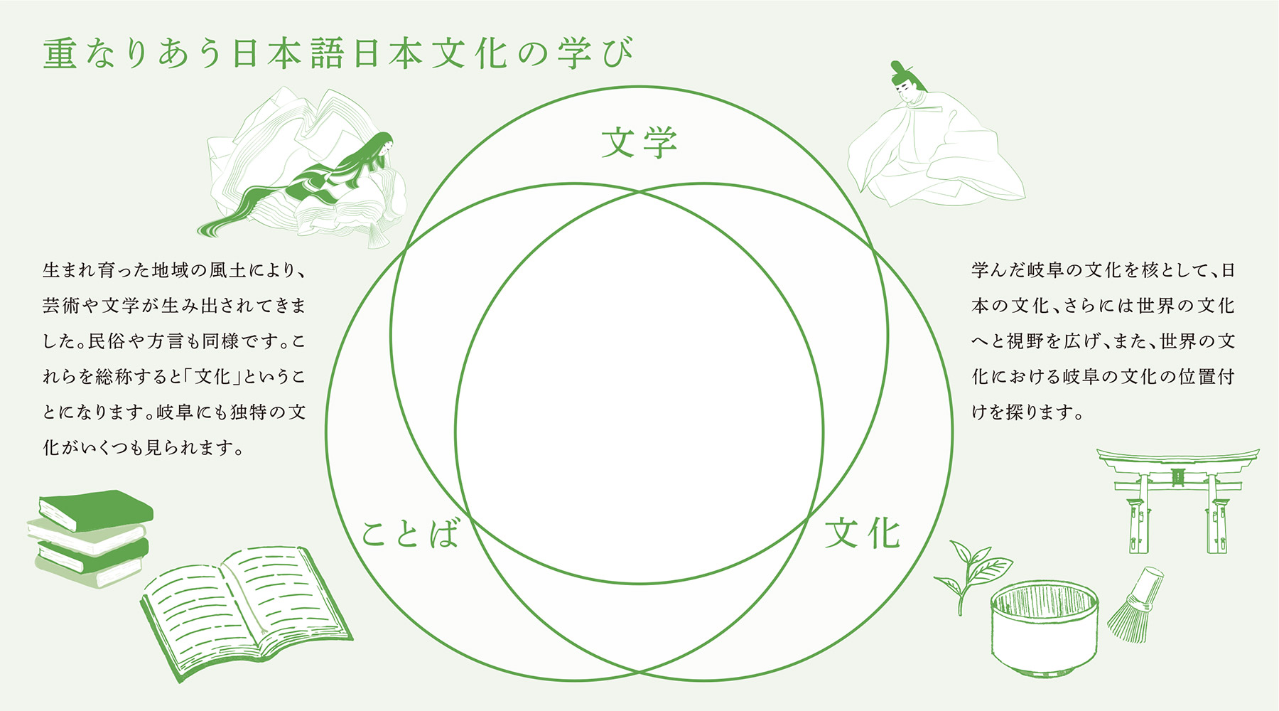 日本人に受け継がれてきた自然との調和による美意識、気候・風土による生活様式、外国文化の受容と変容による諸芸術などから、現代の私たちの思考や行動との関係を捉えていきます。その先には、日本文化の継承と創造および国内外へ発信する文化の担い手としての目標が見えてきます。