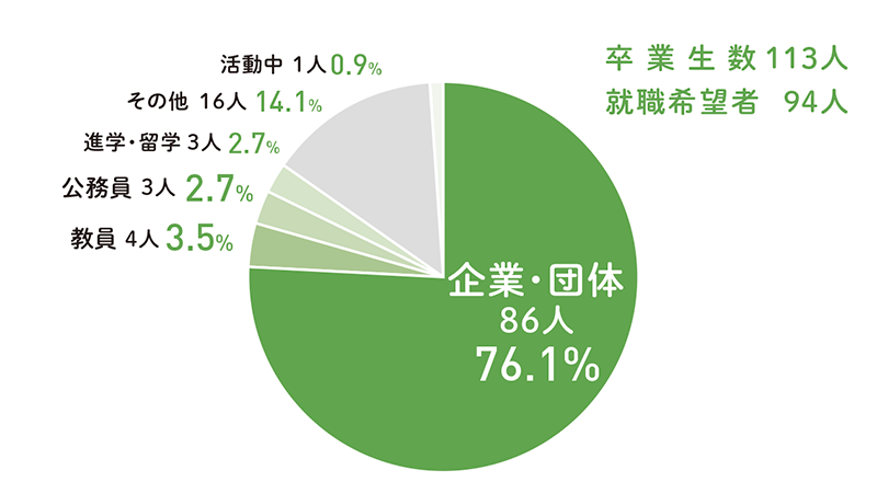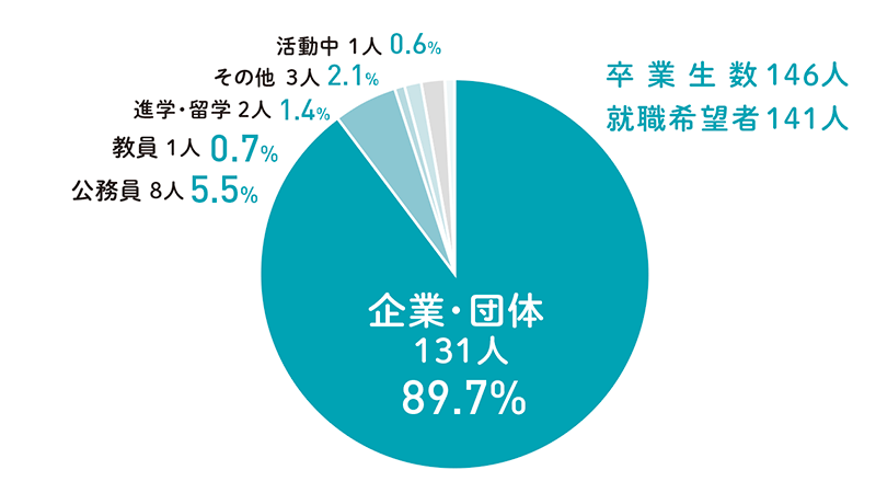 - 約150社が参加の学内合同企業説明会や就職合宿。企業への高い就職実績を実現する豊富な機会を提供。